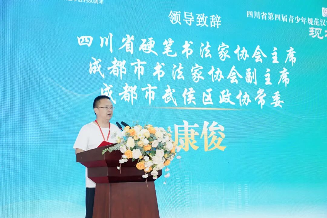 康俊在现场决赛致辞中表示:2025年,适值中国人民抗日战争暨世界反法西斯战争胜利80周年,为纪念这一伟大历史时刻,传承和弘扬伟大的抗战精神,引导广大青少年“铭记历史、缅怀先烈、珍爱和平、开创未来”。同时,根据《中华人民共和国国家通用语言文字法》的要求,认真贯彻落实教育部办公厅《关于进一步加强中小学规范汉字书写教育的通知》精神,规范青少年汉字硬笔书写行为,提高青少年规范汉字硬笔书写水平,检验中小学书法教育成果,推动四川省书法水平测试工作,激励青少年热爱中国文字和书法艺术,培养青少年丰厚的人文素养和审美情趣,弘扬中华优秀传统文化,四川省硬笔书法家协会特举办“德维致远杯”四川省第四届青少年规范汉字硬笔书写大赛,大赛分初赛和现场决赛两个阶段。本次大赛征稿启事发出后,全省各地硬笔书法组织、学校等积极动员,青少年踊跃参与,2025年9月10日,经过初评、复评和终评,从初赛选手中遴选出279名青少年参加今天的现场决赛。